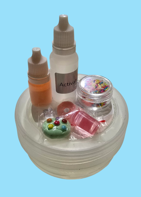 Whats in the box: 250g clear slime, colour of your choise, sprinkles, activator and charms.